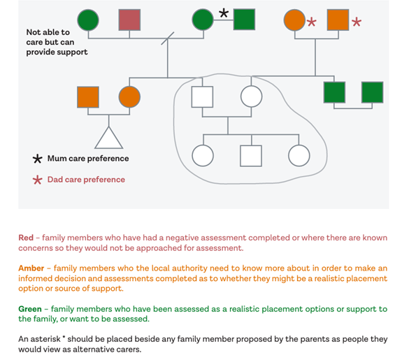 For the local authority area in this judgment, it was set out that in the issuing of all proceedings, the local authority must include in initial evidence a genogram with reference to who has been contacted and what their responses were, and details for any alternative carers. Using a colour coded genogram can be an effective way to display this information to the court.