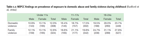 Research for the NSPCC involving a survey of more than 6,000 children and young people [2] in the UK (Radford et al, 2011a) provides us with insight into the numbers affected by domestic abuse. They found 12 per cent of children under the age of 11, 17.5 per cent of children aged 11 to 17, and 23.7 per cent of young people aged 18 to 24 had experienced domestic abuse [3] during their childhood (see Table 1.1). Overall, the study suggests that around one in five children in the UK are likely to have been ‘exposed’ to domestic abuse.