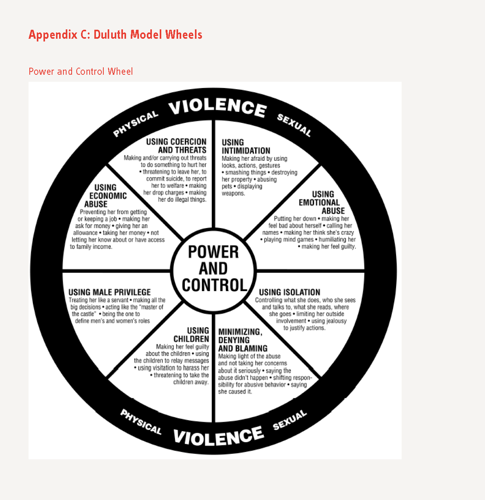 This idea is the central point in one of the first conceptualisations of coercive control, as expressed in the Duluth Model in Minnesota (Pence and Paymar, 1993). The model outlined the ‘Power and Control Wheel’ (see Appendix C) to describe the myriad of behaviours that perpetrators use to control victims of domestic abuse. Power and control is central within the wheel. A number of themes/behaviours around the wheel – such as threats, intimidation, financial abuse and isolation – are the ways in which a perpetrator will seek to establish and sustain control and power over the victim. In the Duluth Model, physical violence is on the outer edge of the wheel; it is a tactic that a perpetrator will use when the abusive behaviours do not work or as a way to ensure the threat of violence maintains the victim’s compliance.